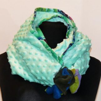 Écharpe double tour en minky turquoise, bleu jean et anis