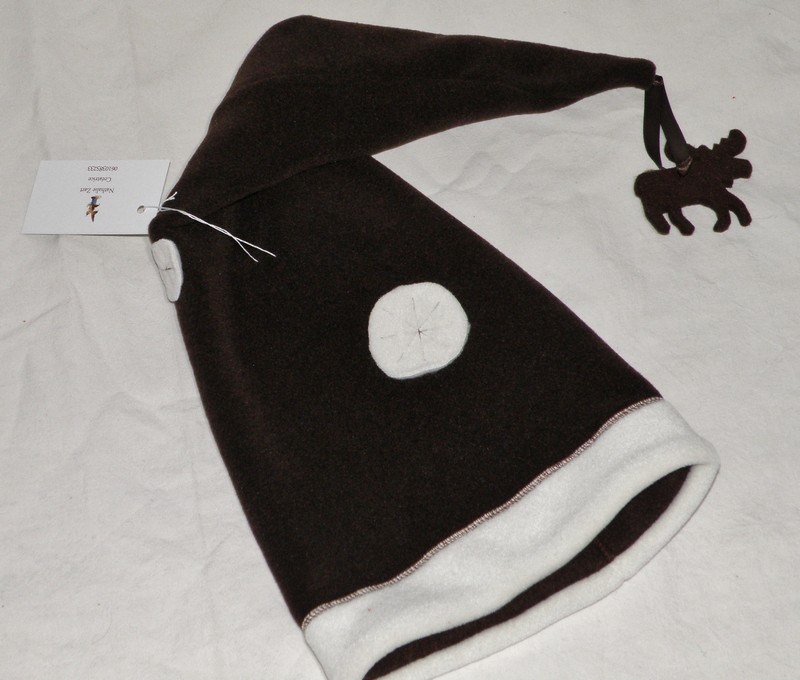 Bonnet lutin très long en polaire velours chocolat et blanc sujet petit renne à la pointe Lavage à 30° séchage à plat