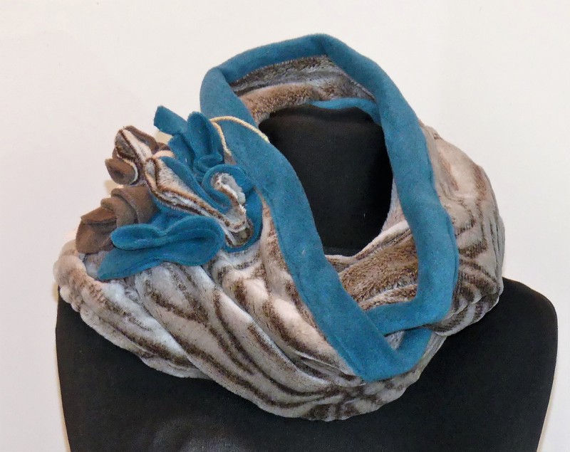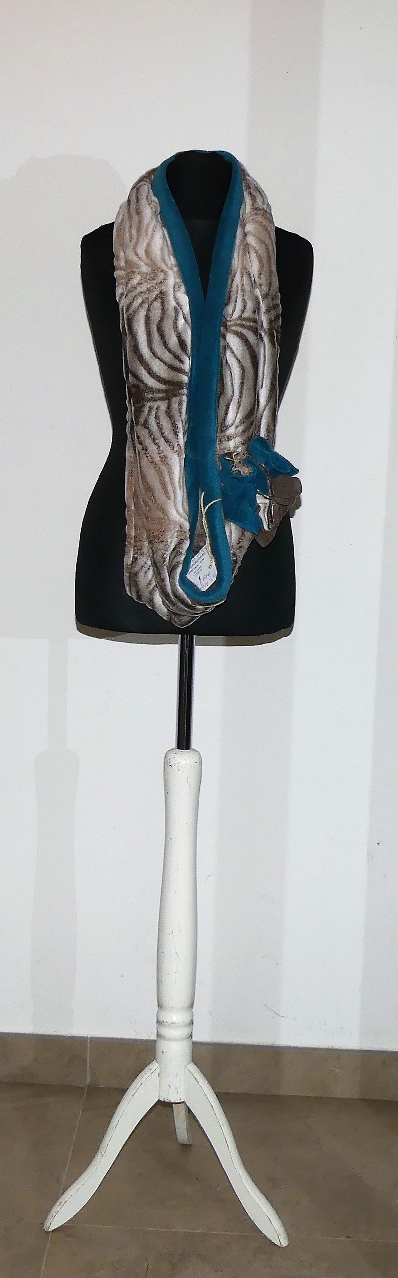 Écharpe double tour en fausse fourrure marron givré bien chaude et toute douce bordure de polaire et fleur en polaire.
