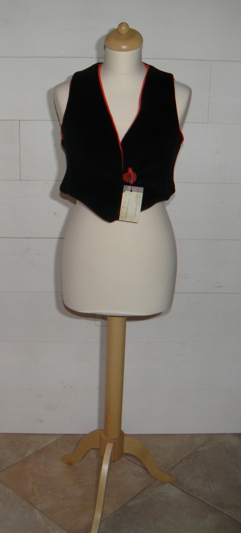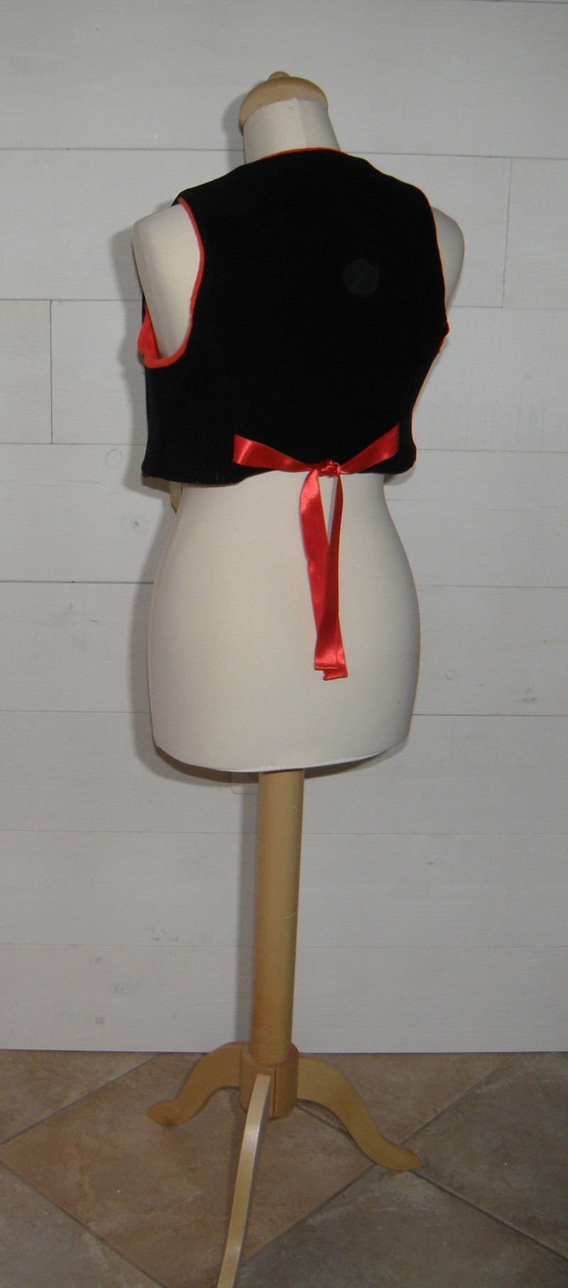 Gilet sans manche très court, découpe princesse, Ruban de satin pour resserrage dans le dos.Noir et doublure pulpe surpiqûre sur les cotés Fermeture par un bouton sur le devant.