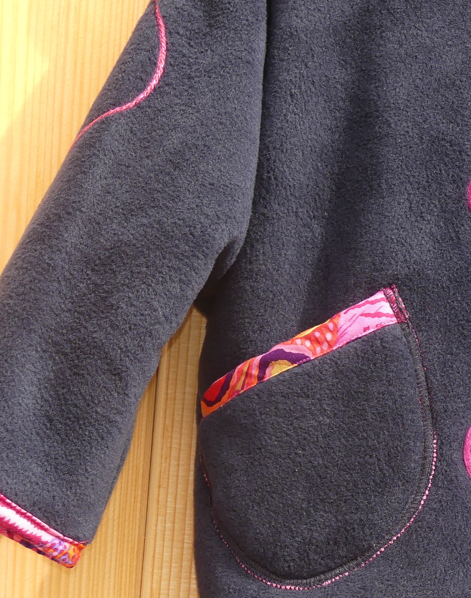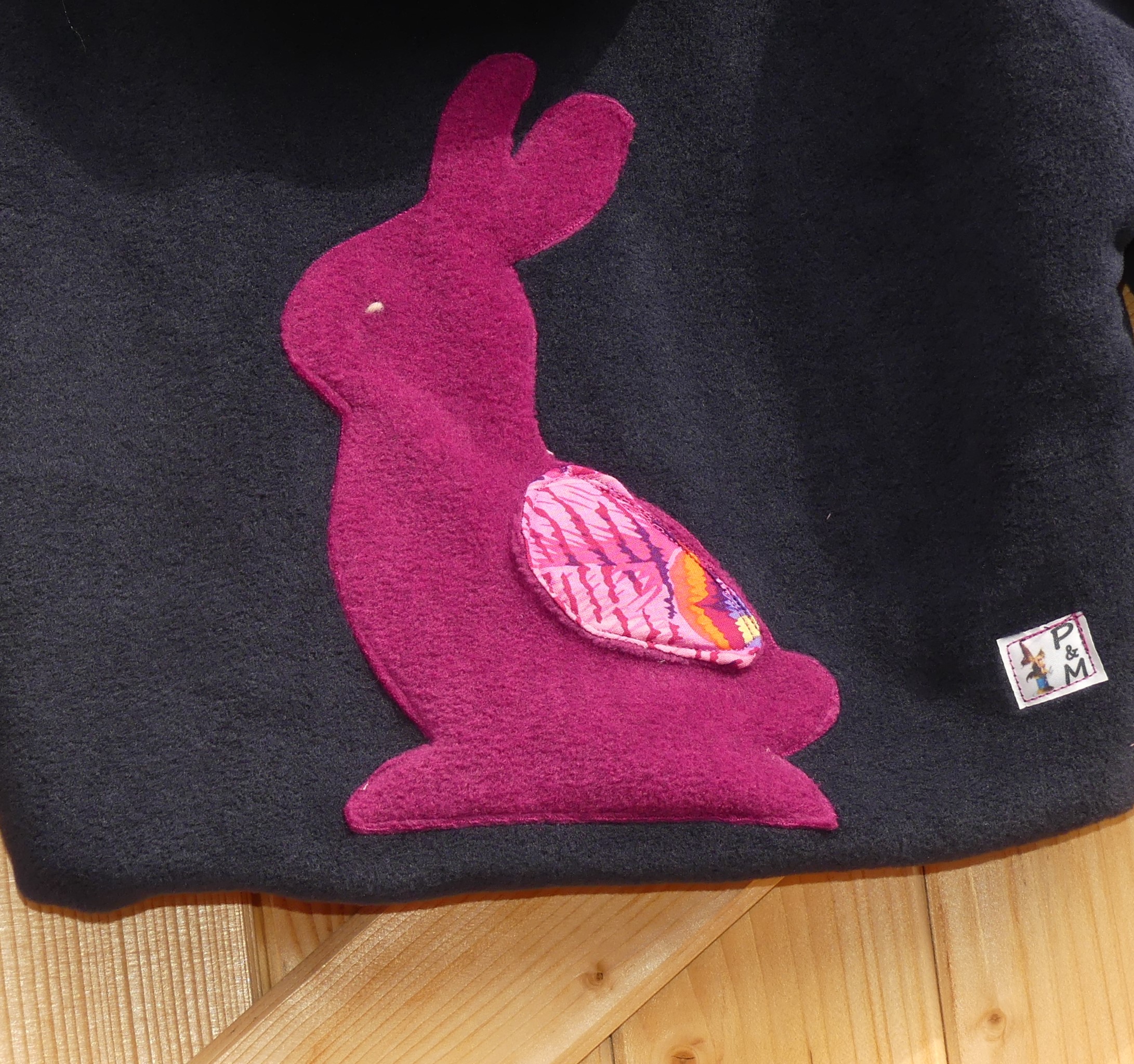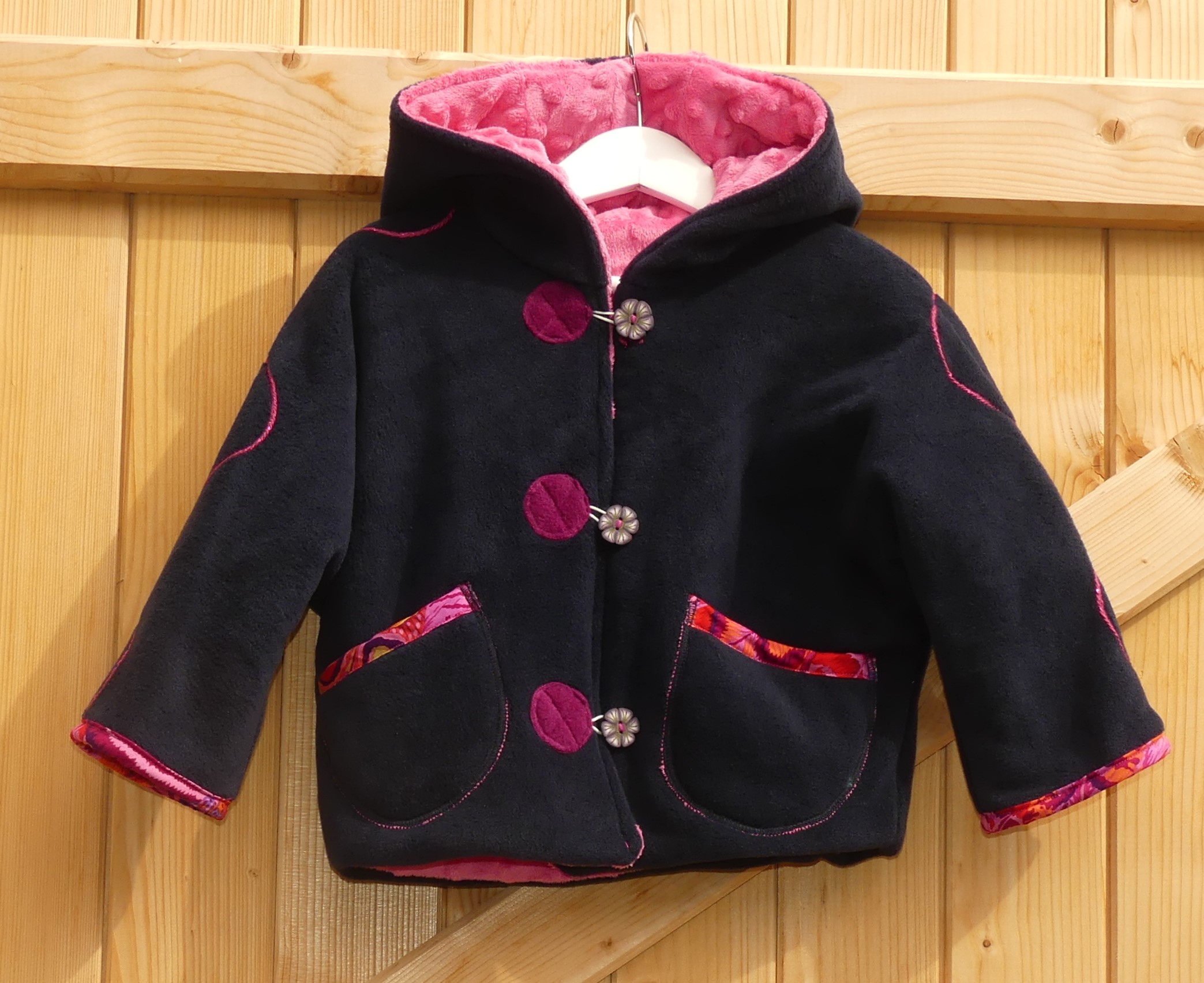 Veste polaire pour bébé fille entièrement doublée de minky rose bonbon, application d’un petit lapin, de biais de coton coloré, fermeture par bouton en pâte fimo. Taille 1 an.