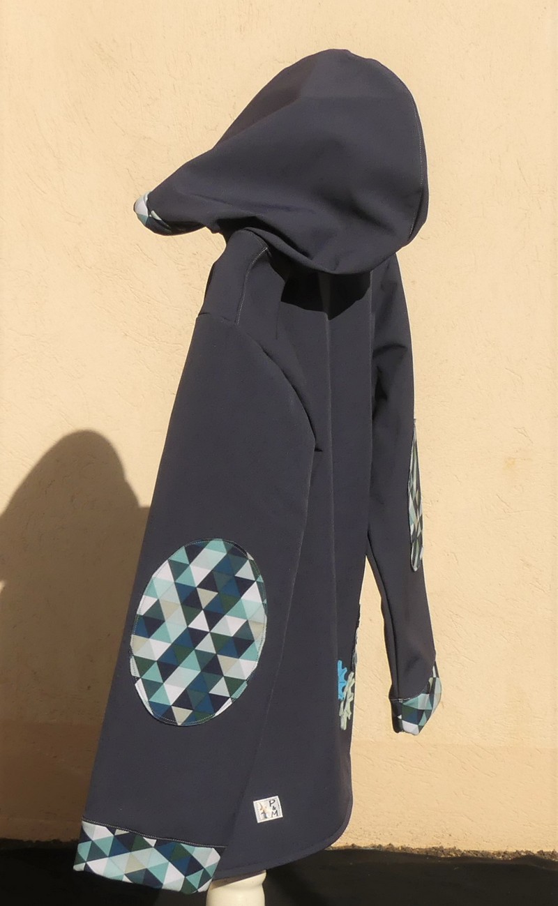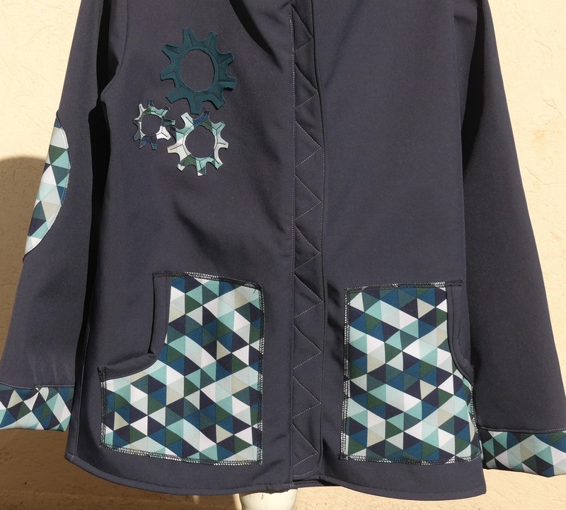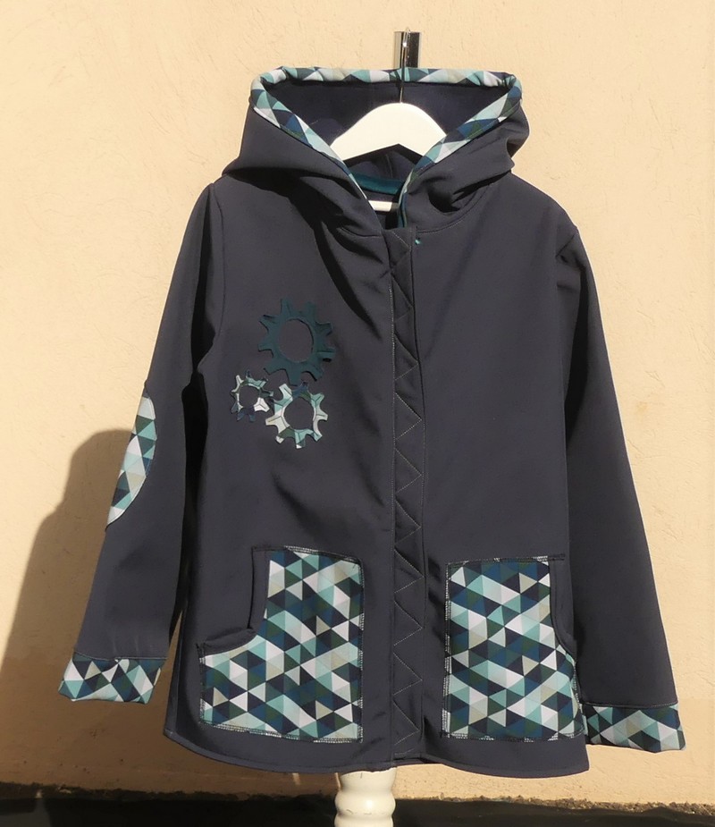 Veste en softshell bleu fonce et sea blue imprimer losange, avec motif engrenage, capuche ronde , grandes poches sur le devant fermeture par zip.