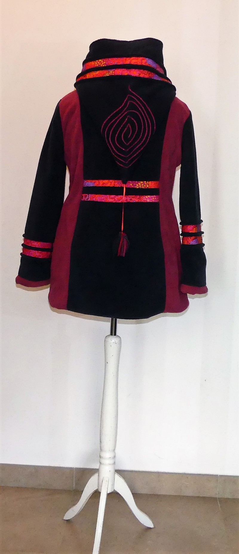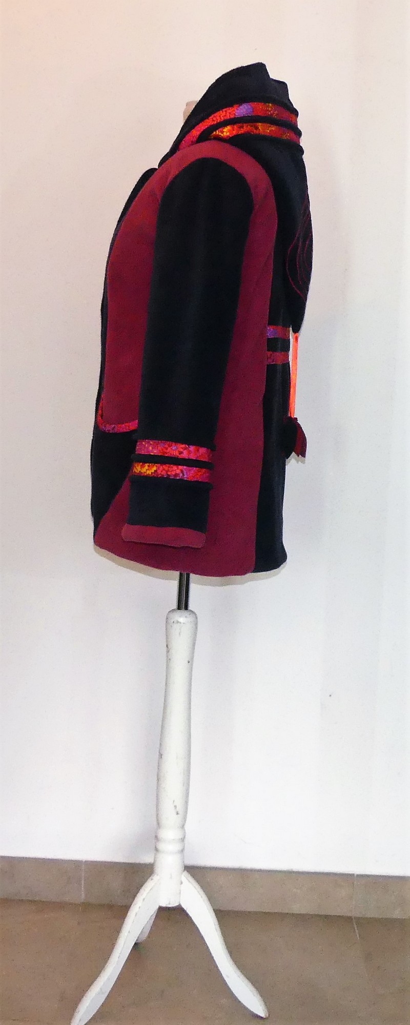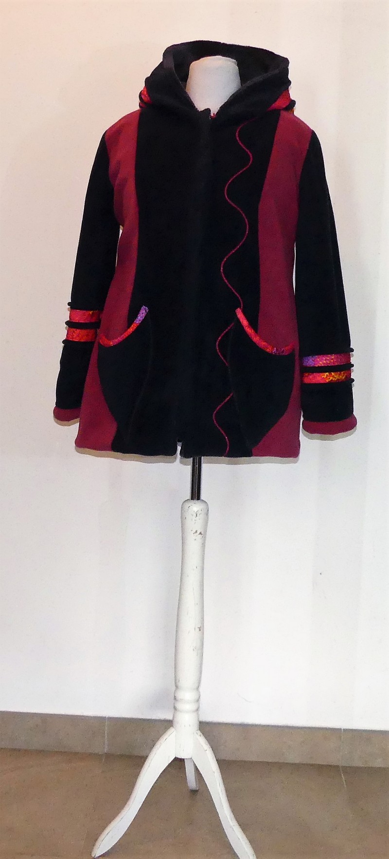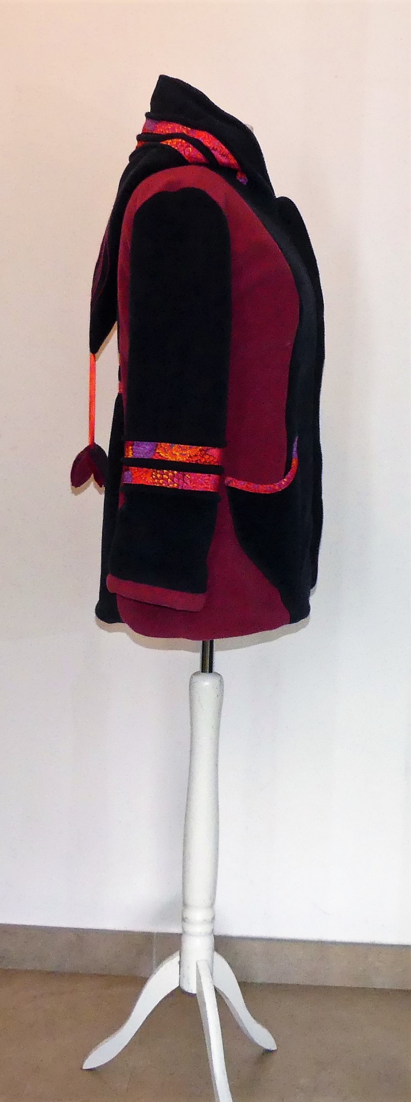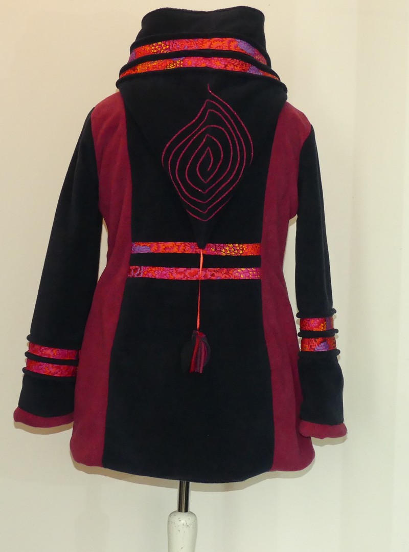 Veste/manteau longue en polaire velours marine et fuchsia entièrement doublée de tissu doudou marine bien chaude et douillette .
