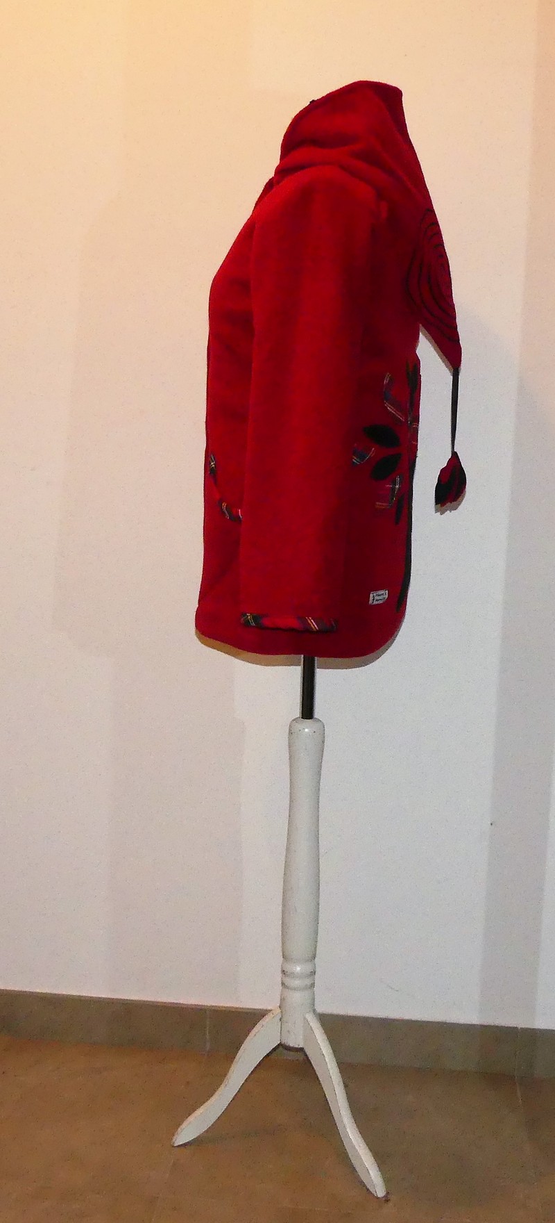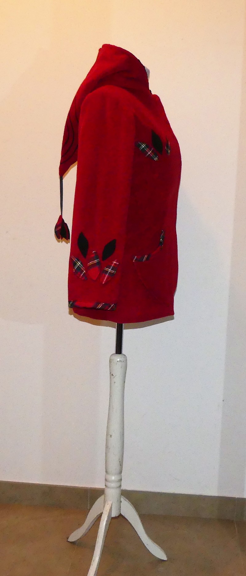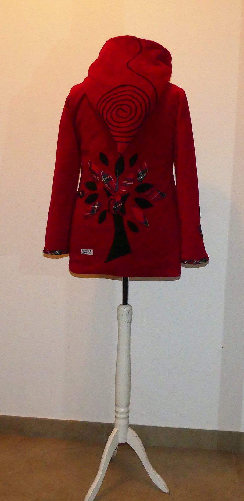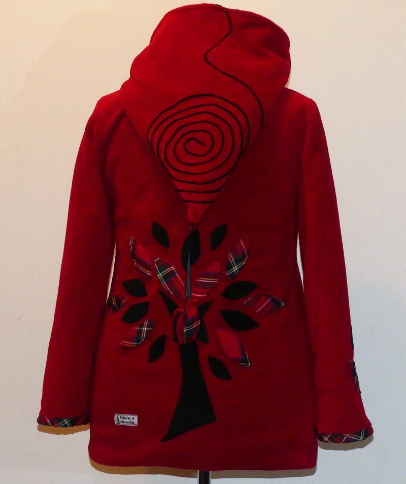 Veste longue lutin en polaire velours rouge vif entièrement doublée de minky noir (velours cloquée) application d’un arbre de vie multicolore.