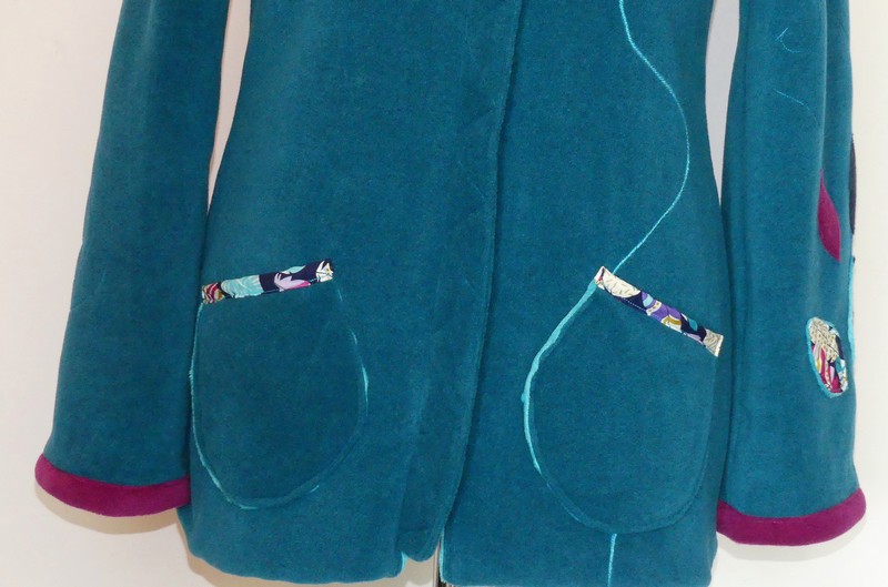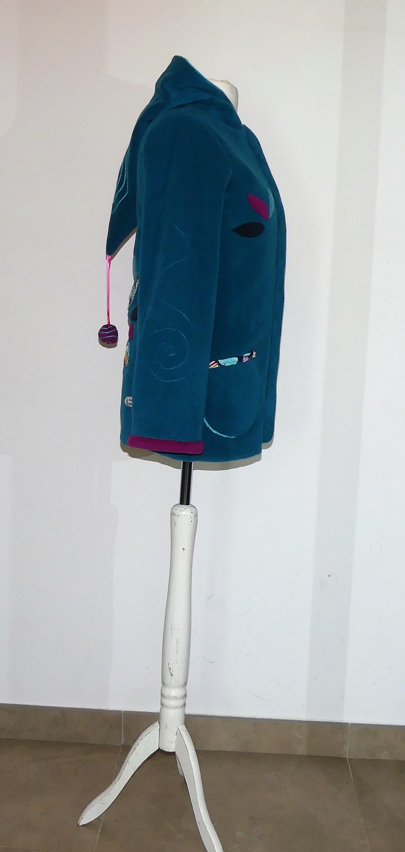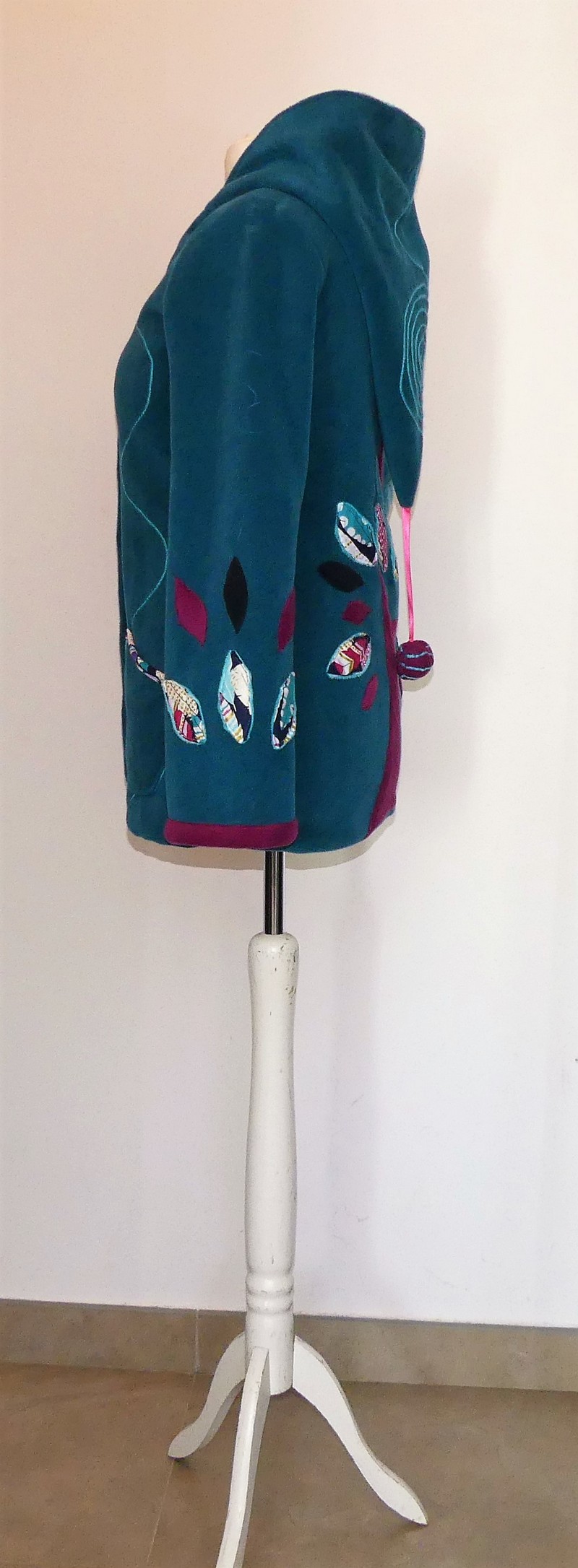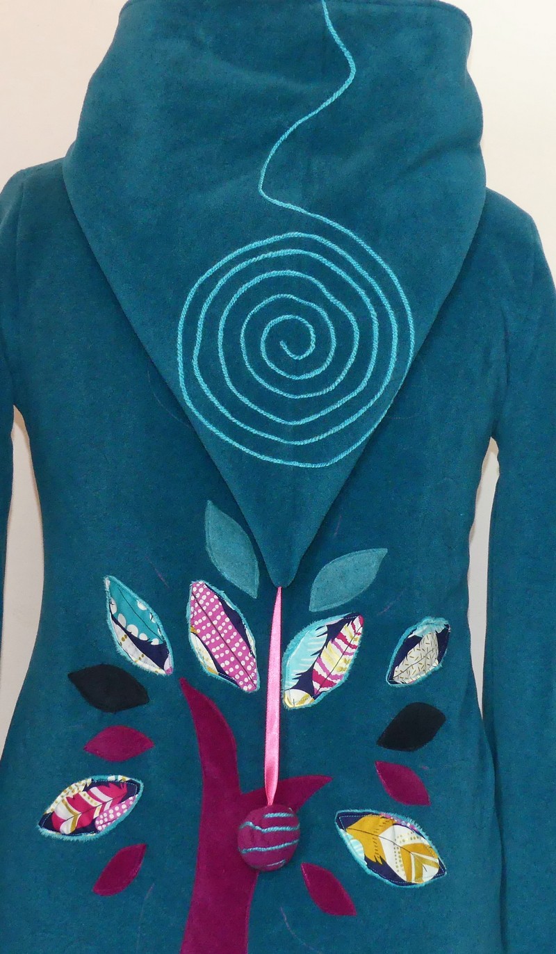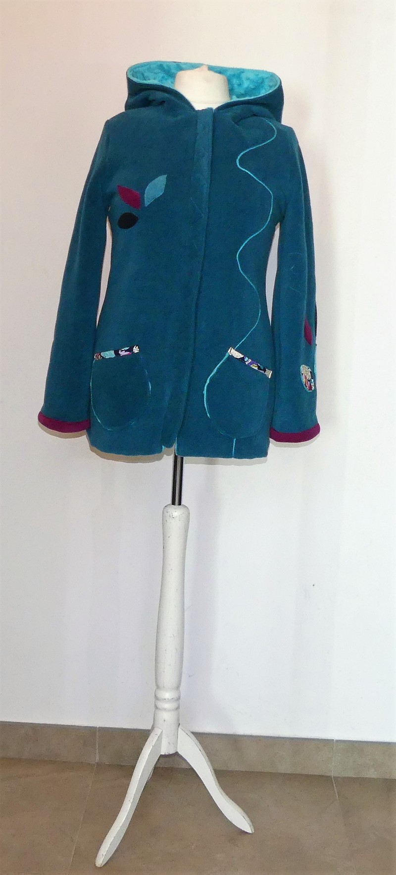 Veste longue en polaire sea blue avec capuche lutin entièrement doublée de minky turquoise,