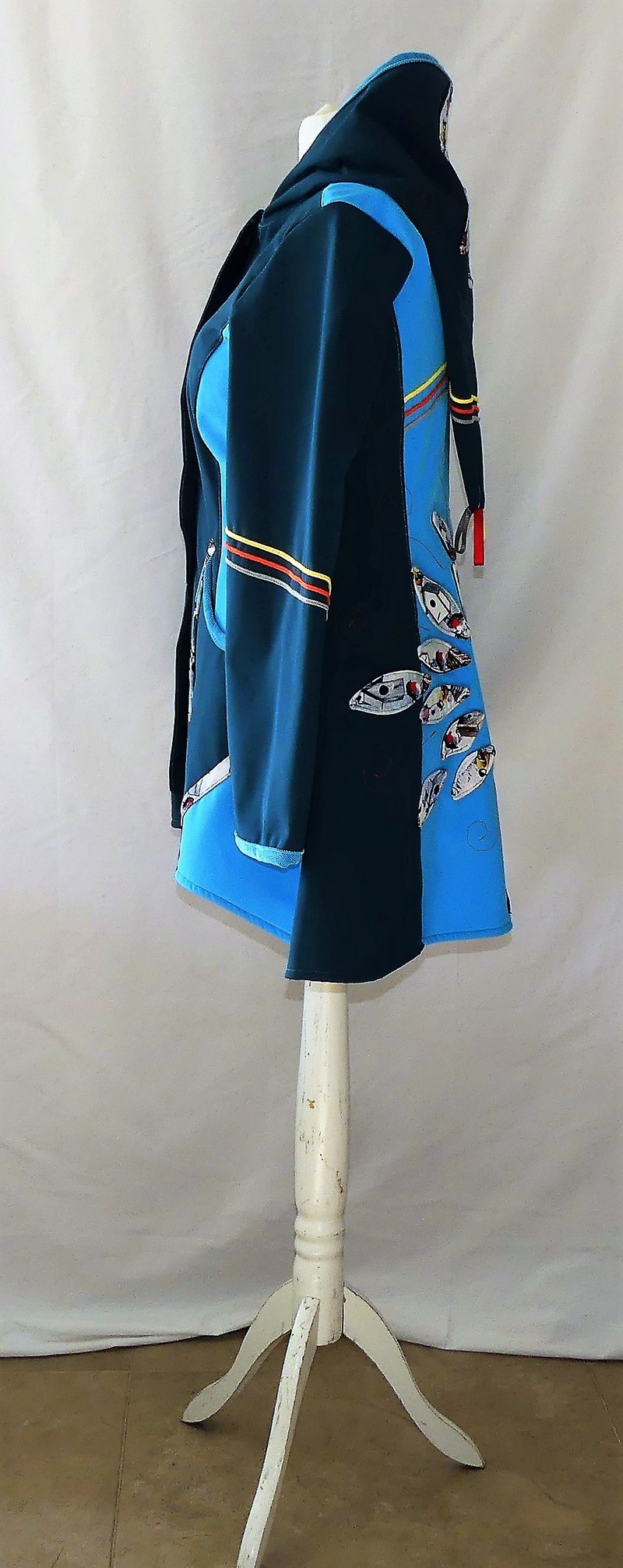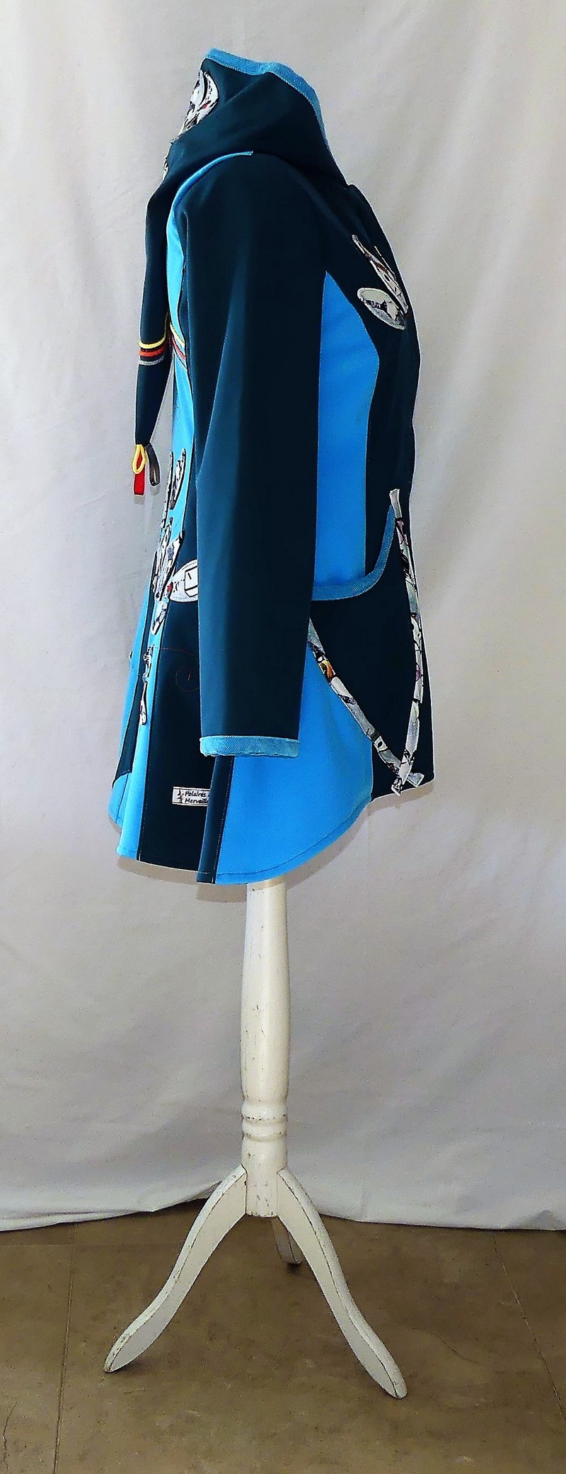 Veste en Softshell coupe princesse avec capuche lutin, bicolor sea blue et turquoise, le softhell est un tissu technique coupe vent, déperlant, respirant et procure une isolation thermique pour la mi-saison.Taille 40/42