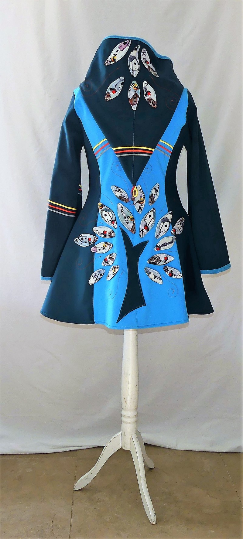 Veste en Softshell coupe princesse avec capuche lutin, bicolor sea blue et turquoise, le softhell est un tissu technique coupe vent, déperlant, respirant et procure une isolation thermique pour la mi-saison.