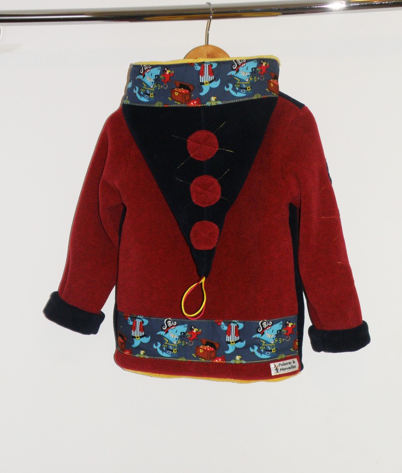 Veste polaire rouge et marine avec capuche lutin doublée tissu doudou jaune application de coton « pirate » (très chaude car bien moelleuse et épaisse)
