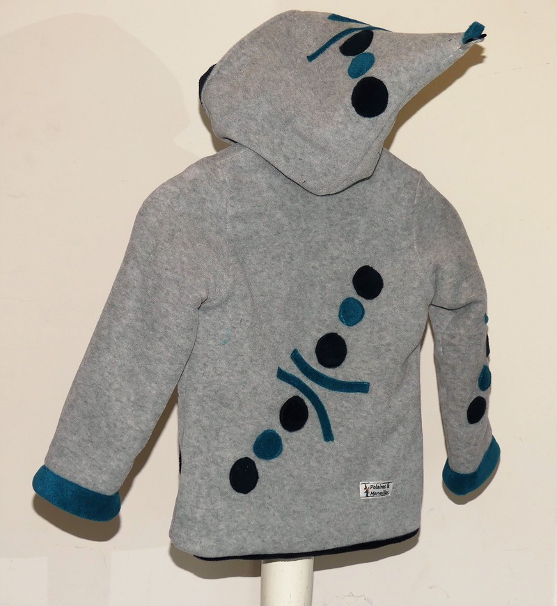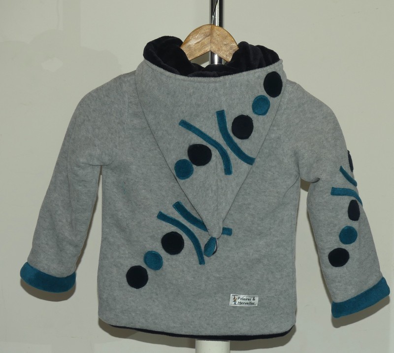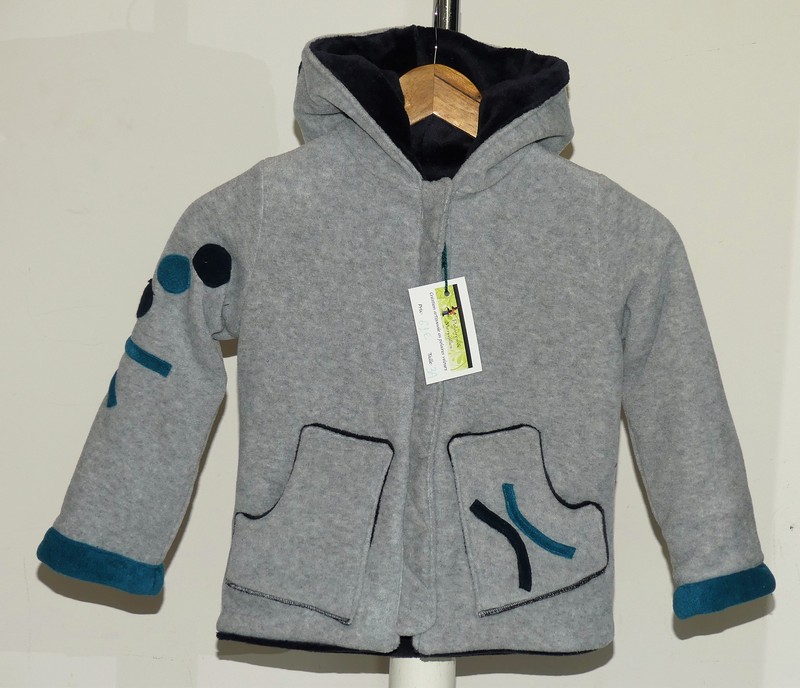 Veste lutin en polaire gris clair entièrement doublée de tissu doudou marine (micro polaire a poil long) , applications de motifs géométriques marine et sea blue. Très chaude un manteau…
