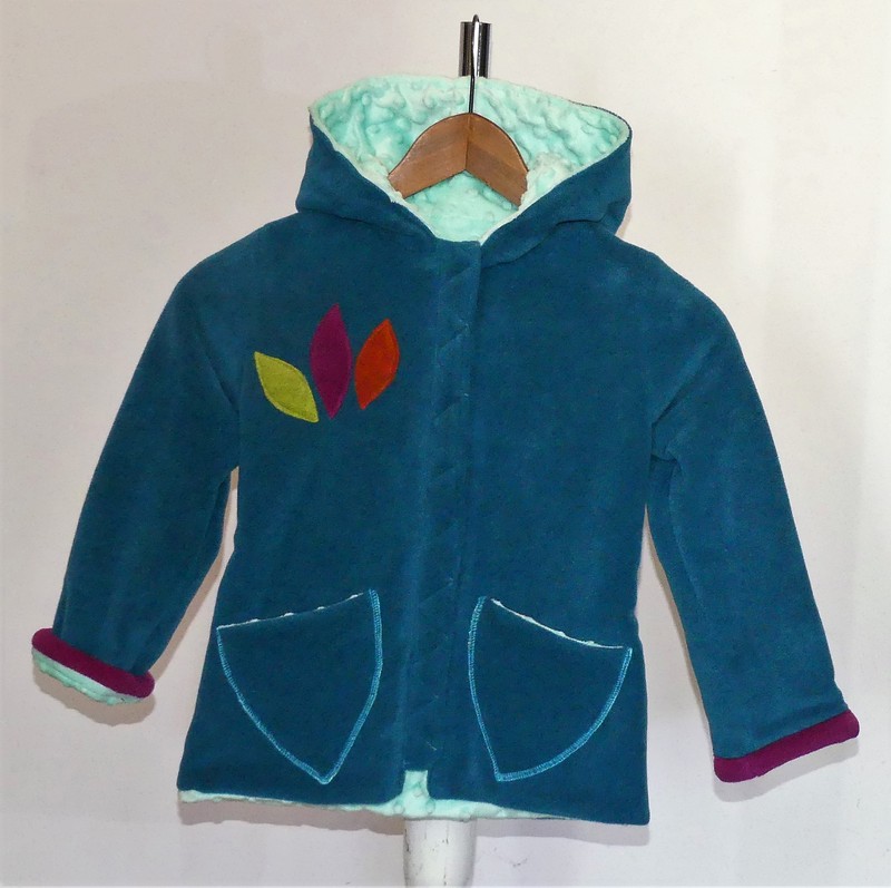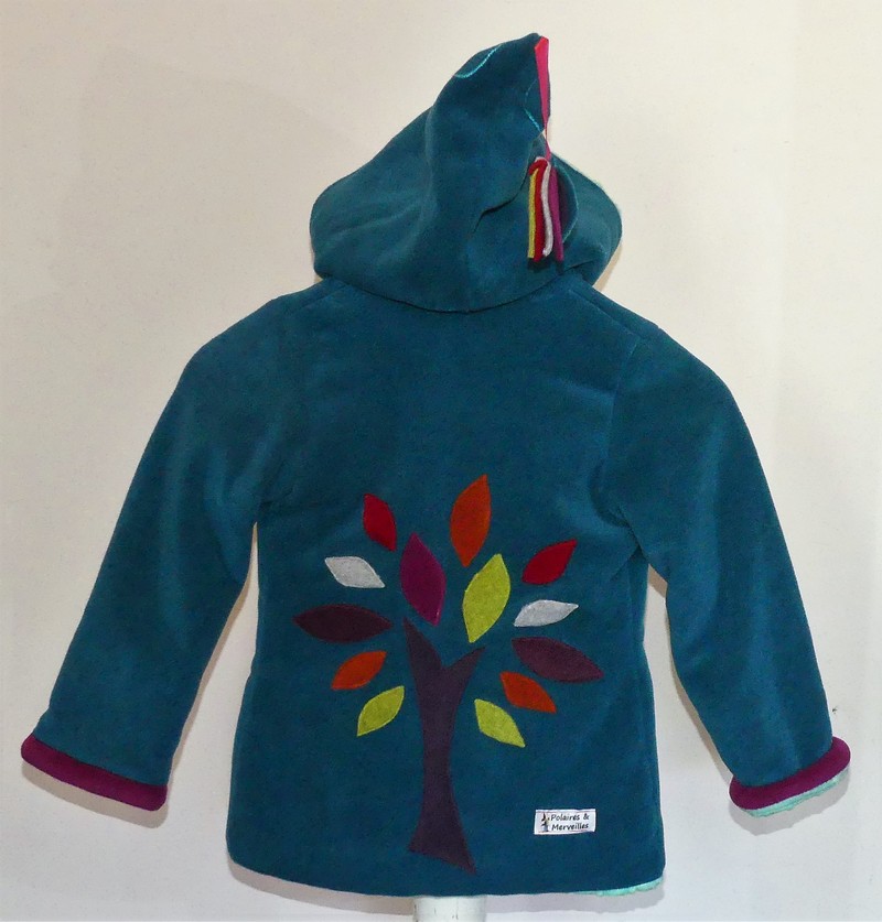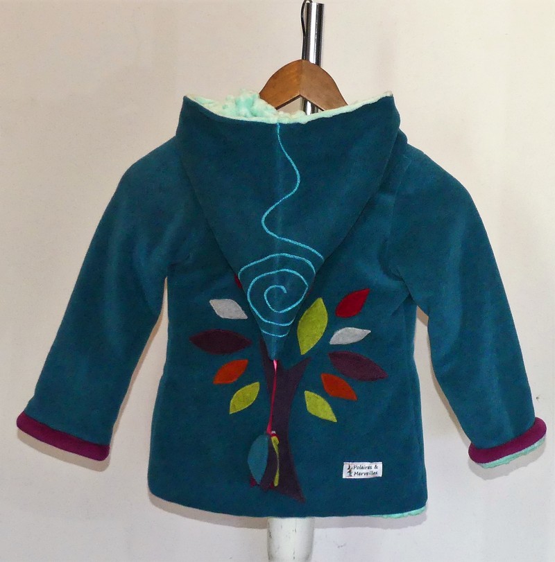 Veste en polaire velours sea blue entièrement doublée de minky vert d’eau (velours cloqué) application d’un arbre de vie multicolore, très chaude par sa composition, un petit manteau parfait, doux confortable.