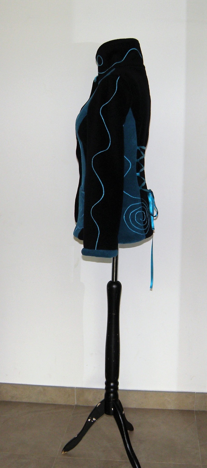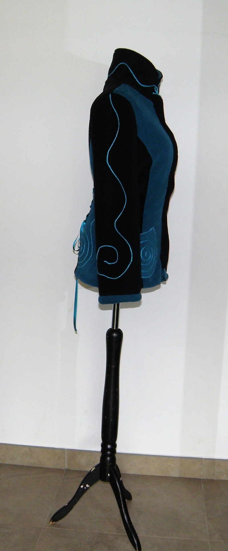 Veste polaire noir et sea blue entièrement doublée de minky (velours cloqué) grand col montant, découpe princesse et jeux de lacets de satin au dos.