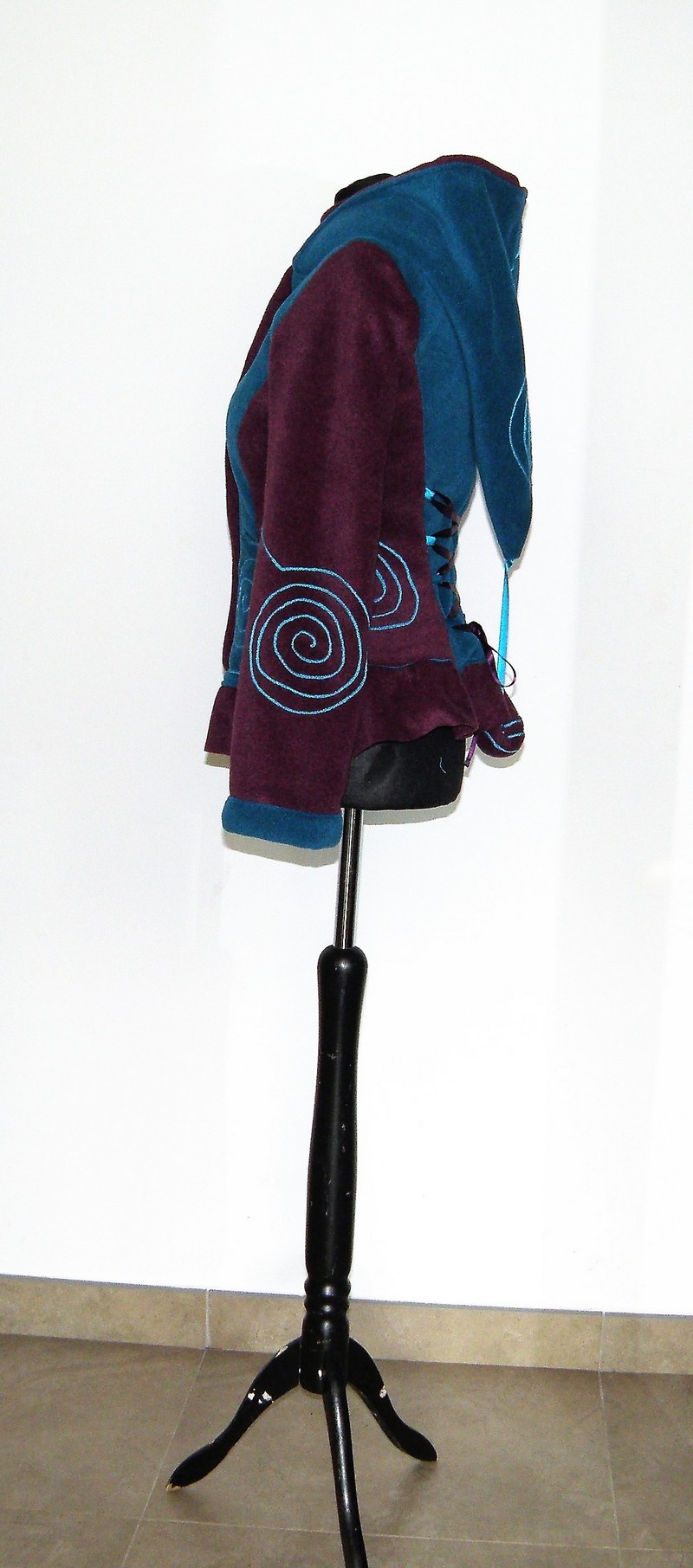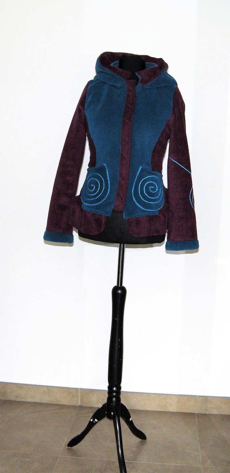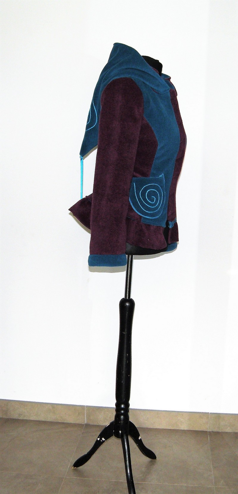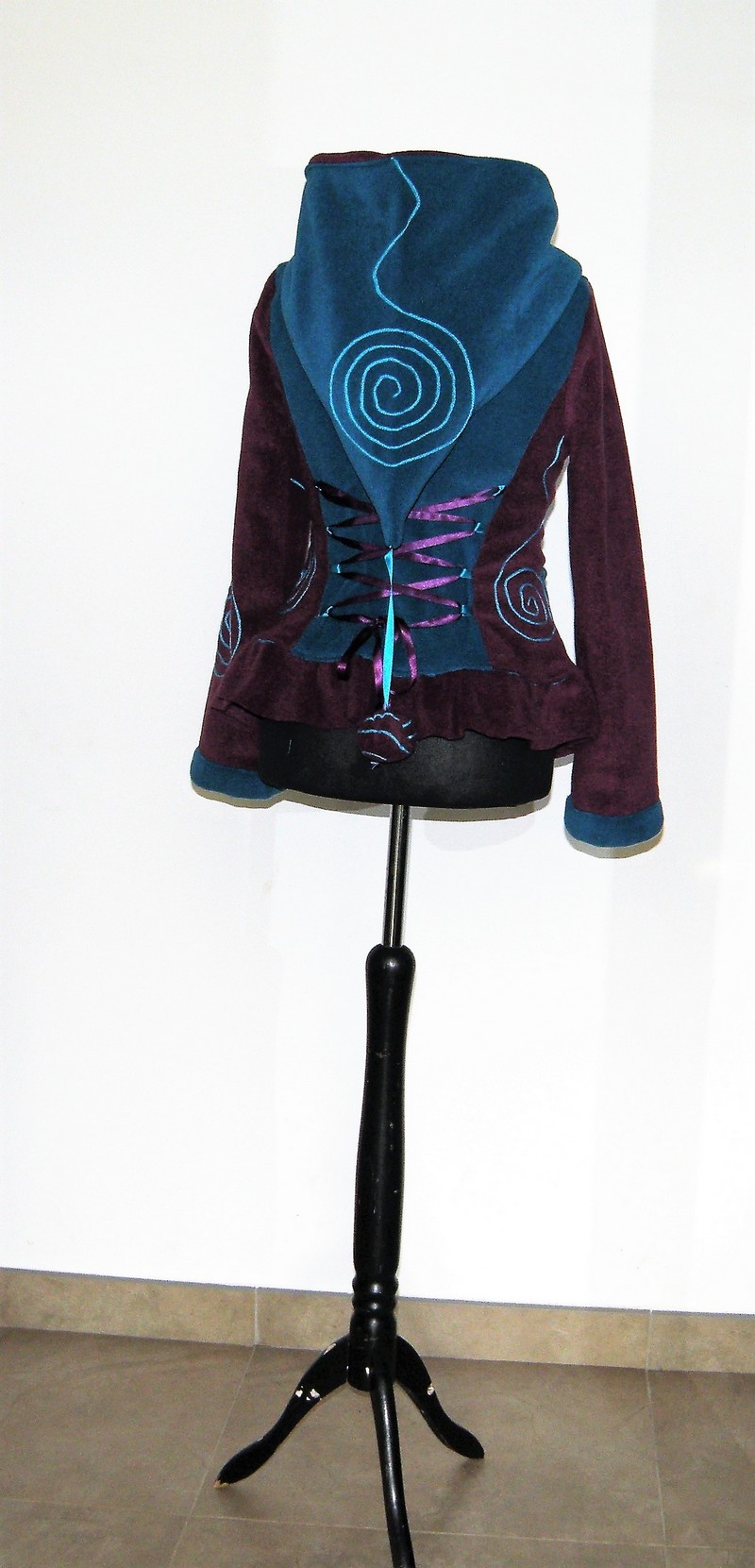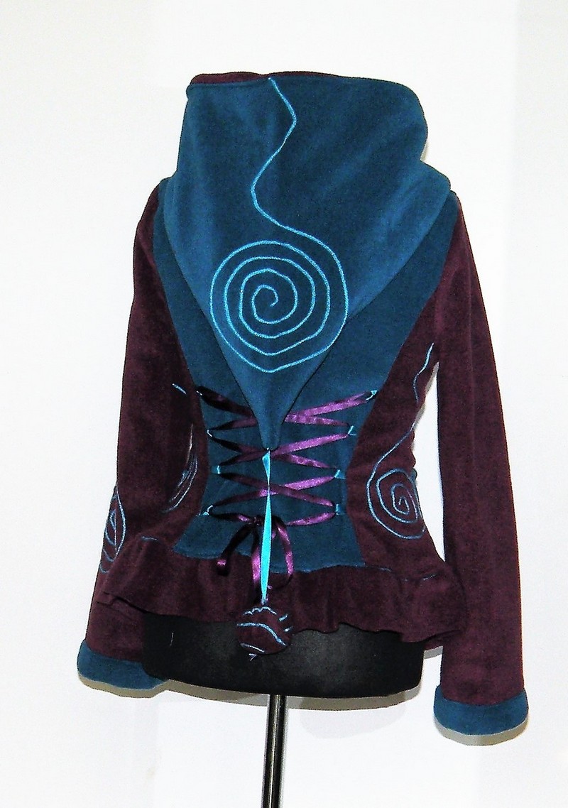 Veste en polaire velours avec découpe princesse, petit col, capuche lutin,laçage de satin au dos et volant , entièrement doublée de minky (velours cloqué) taille 36/38