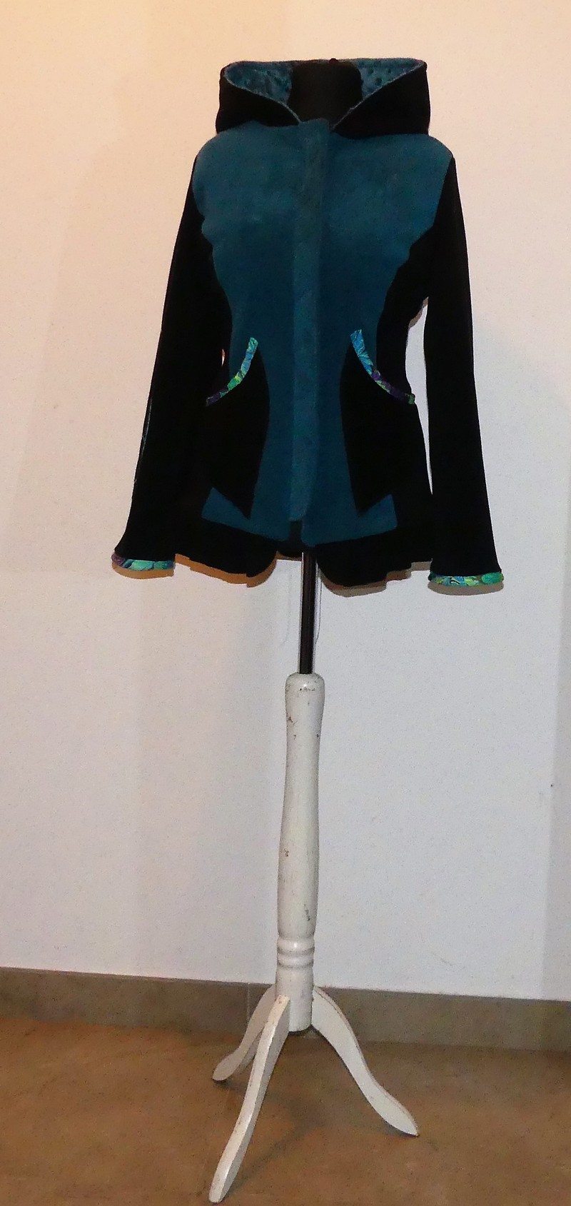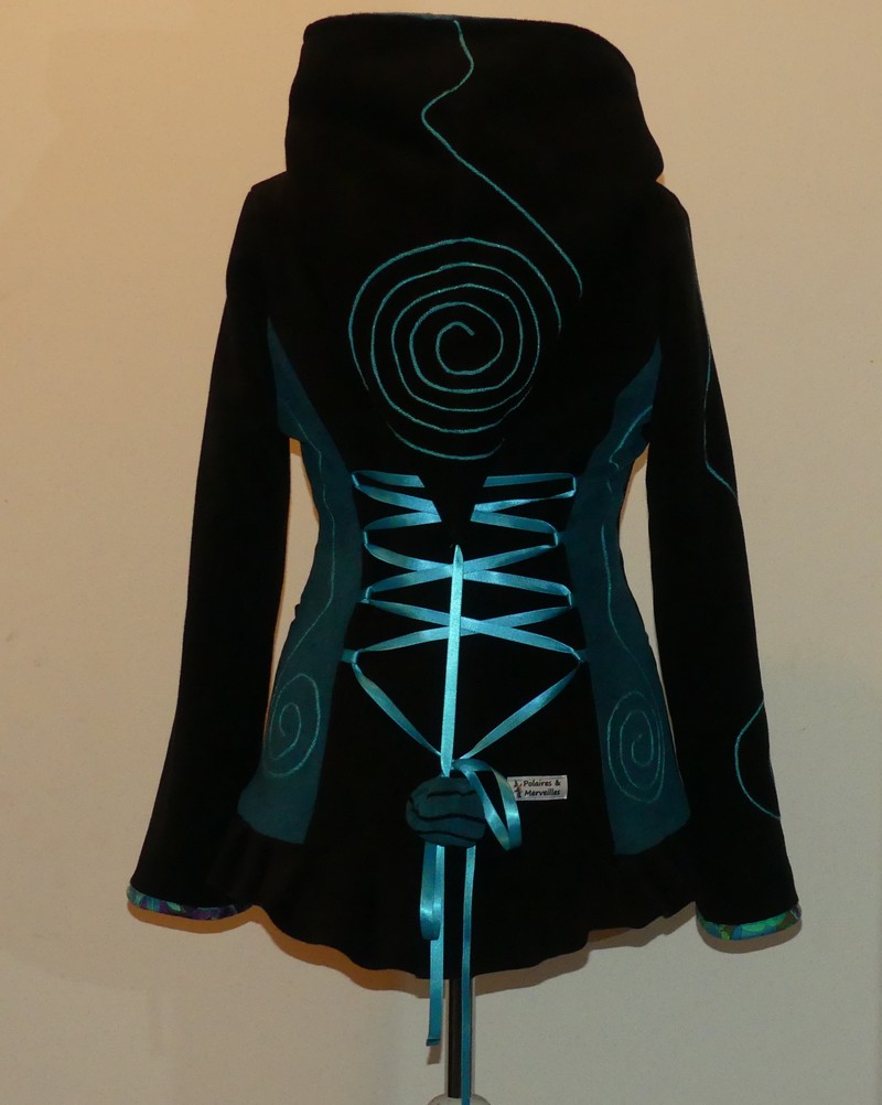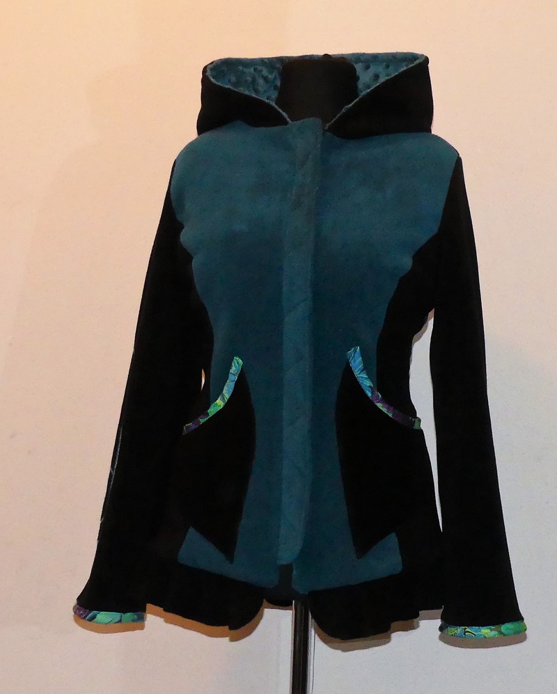 Veste en polaire velours noir et sea blue avec découpe princesse capuche lutin, laçage de satin au dos et volant , entièrement doublée de minky noir (velours cloquée) taille 40