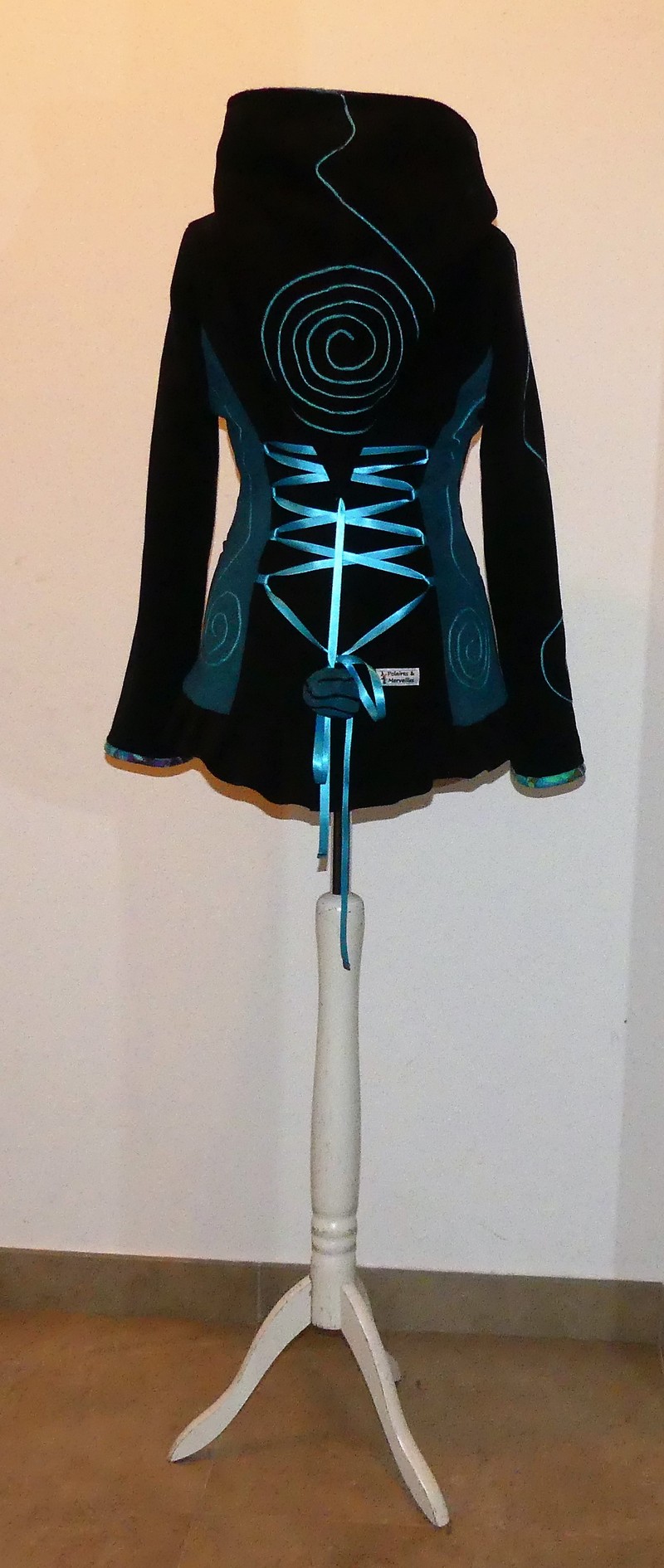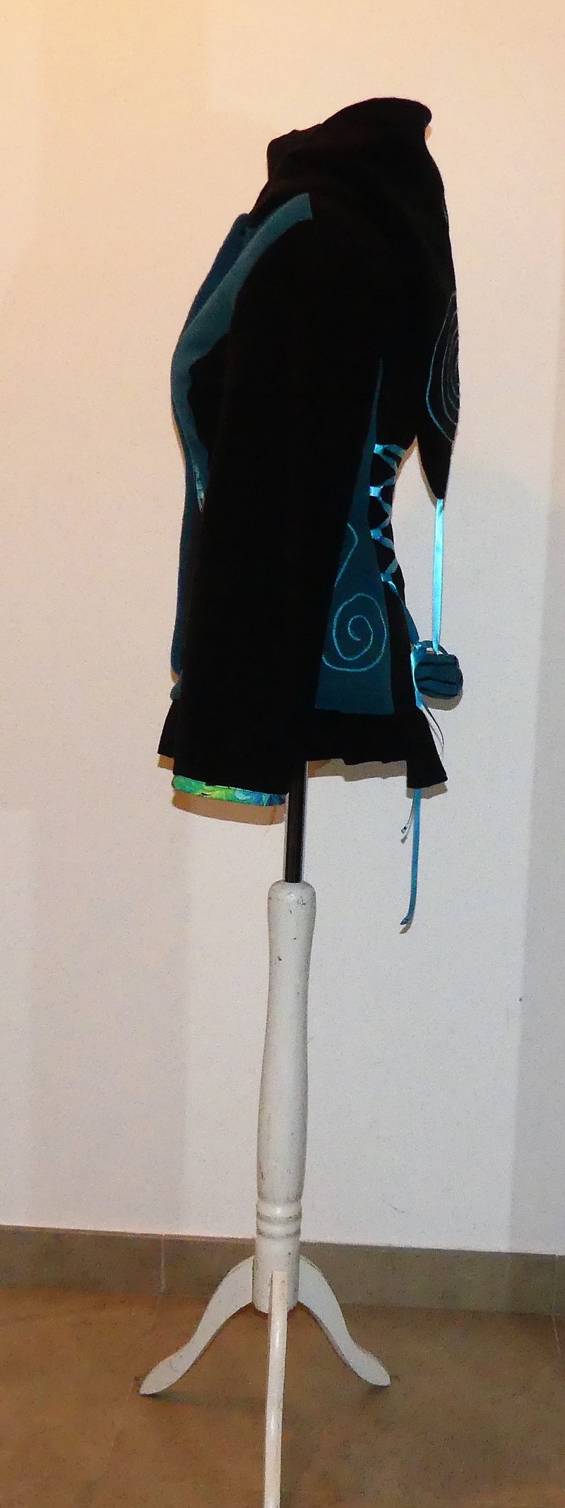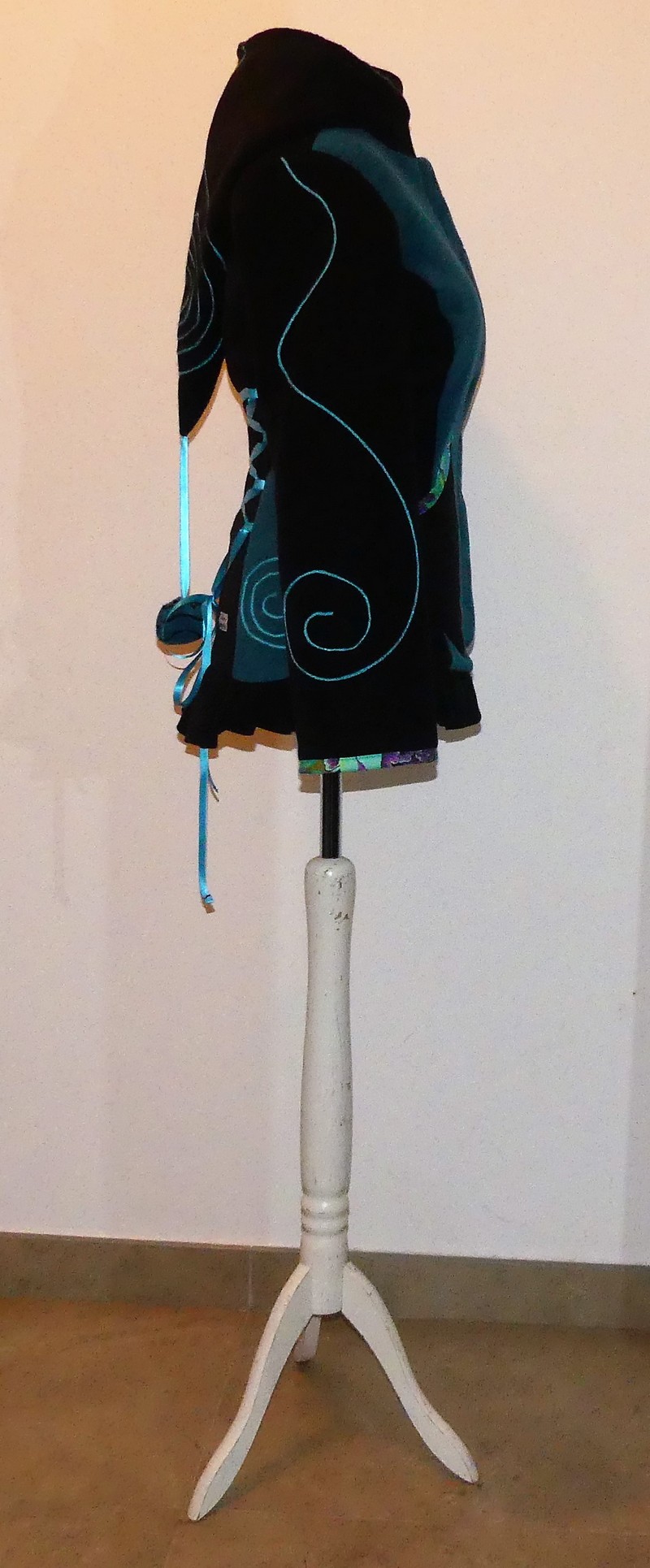 Veste en polaire velours noir et sea blue avec découpe princesse capuche lutin, laçage de satin au dos et volant , entièrement doublée de minky noir (velours cloquée) taille 40