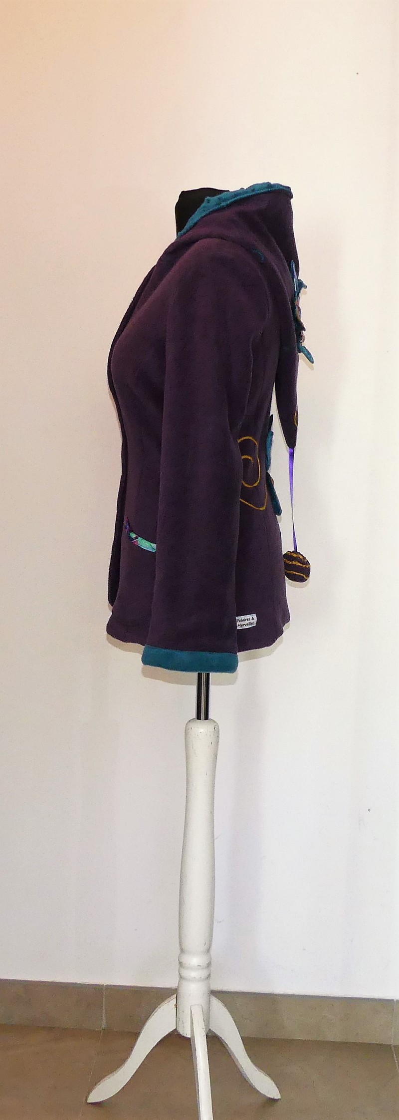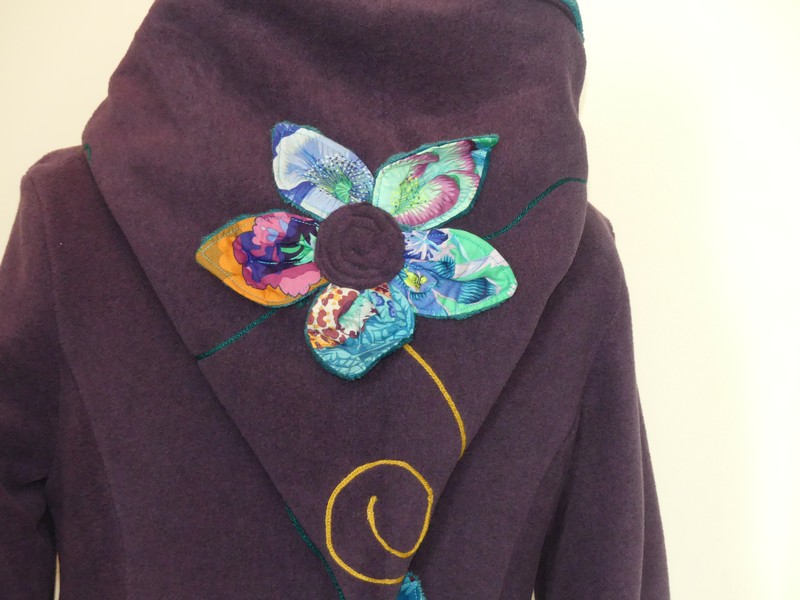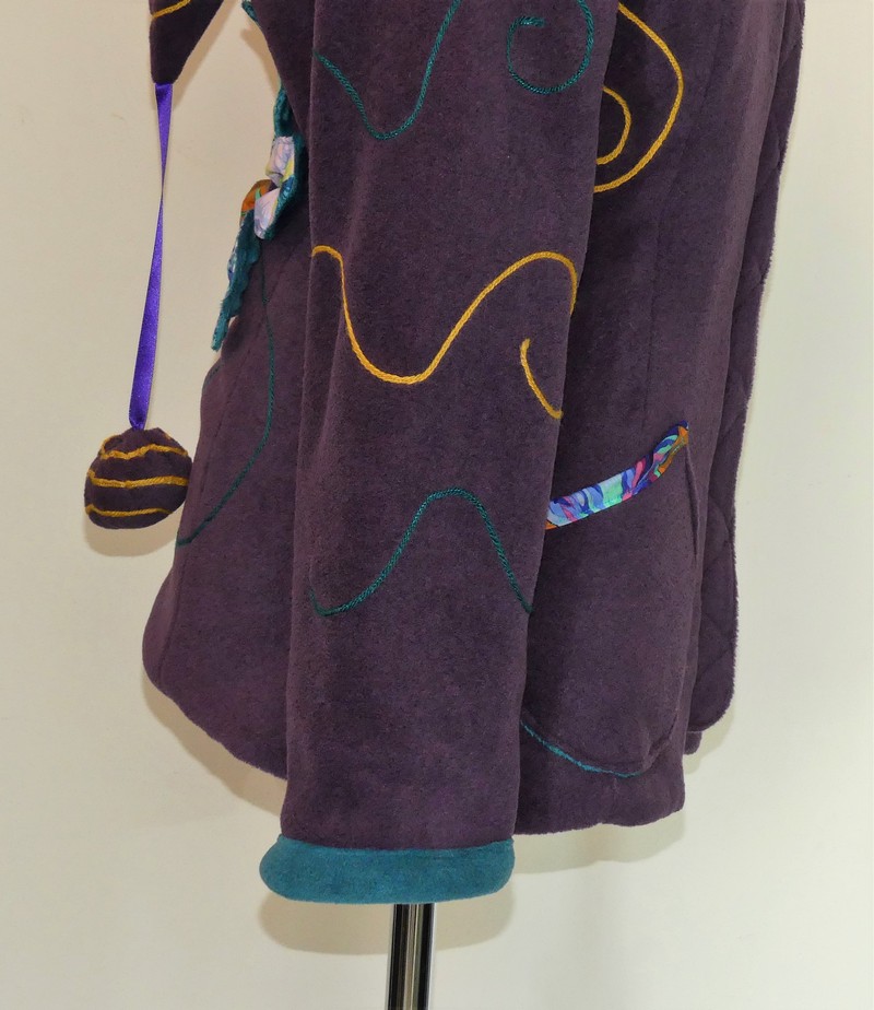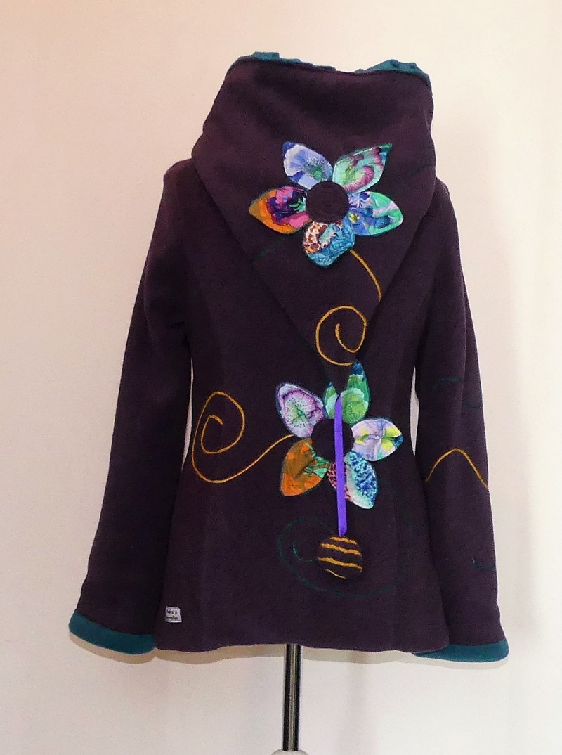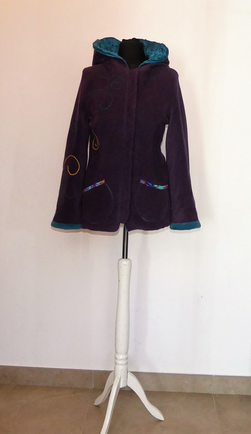 Veste princesse lutin en polaire velours violette entièrement doublée de minky sea blue (velours cloqué) application de fleur en coton sur la capuche et le dos.Taille 38/40