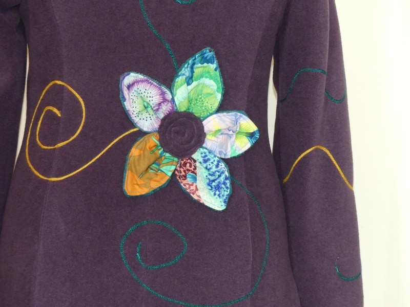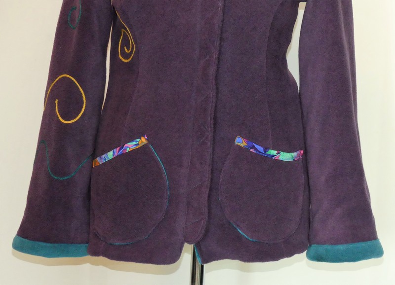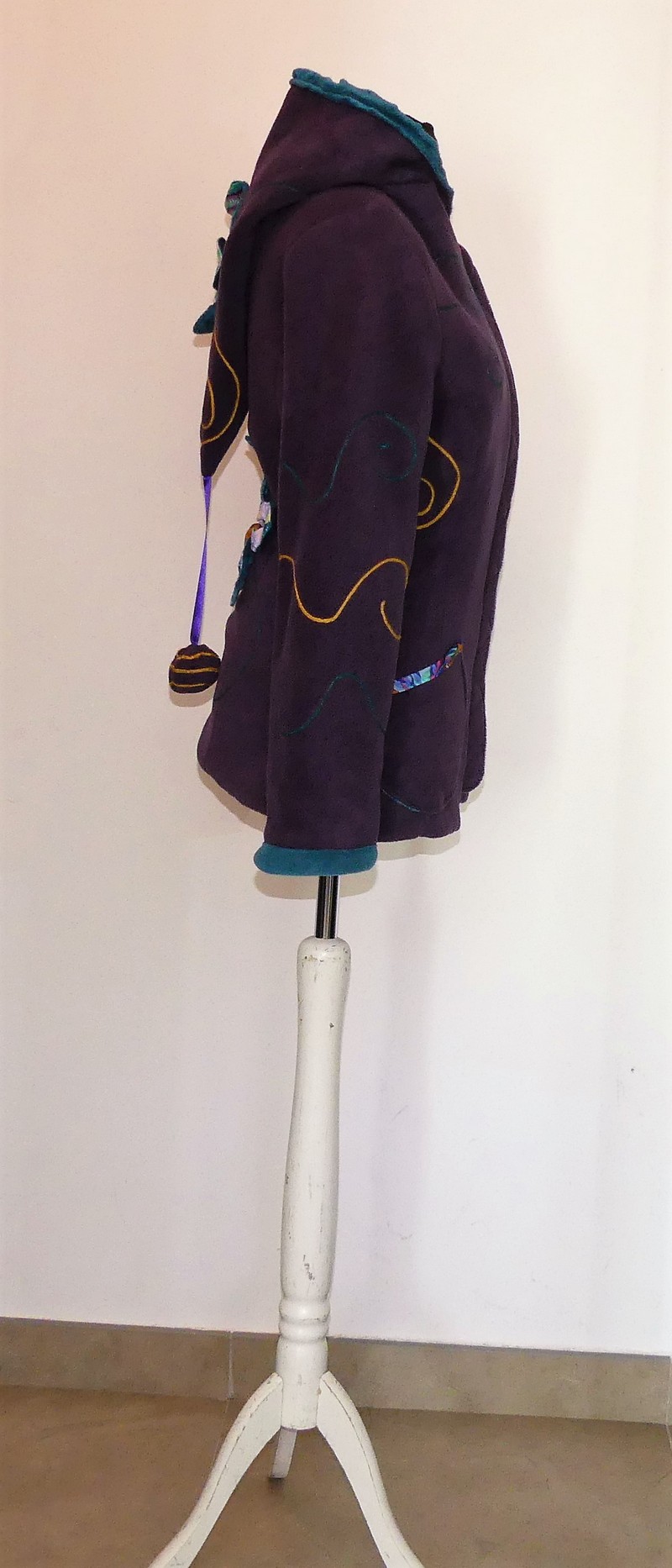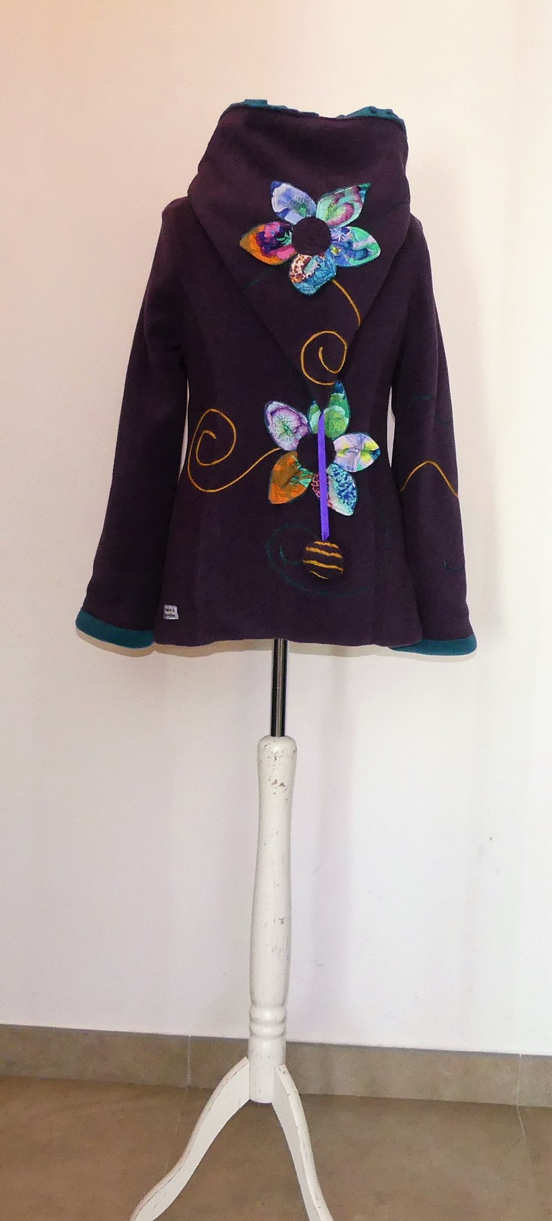 Veste princesse lutin en polaire velours violette entièrement doublée de minky sea blue (velours cloqué) application de fleur en coton sur la capuche et le dos.Taille 38/40